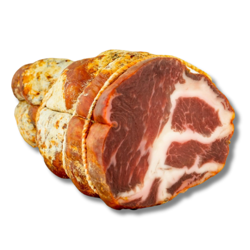 Ottenuto con il muscolo intero del collo di suino nazionale, salmistrato con sale, pepe, spezie e aromi. Insaccato e messo a stagionare per 60/70 giorni. Tranci a partire da 650 grammi confezionato sottovuoto.