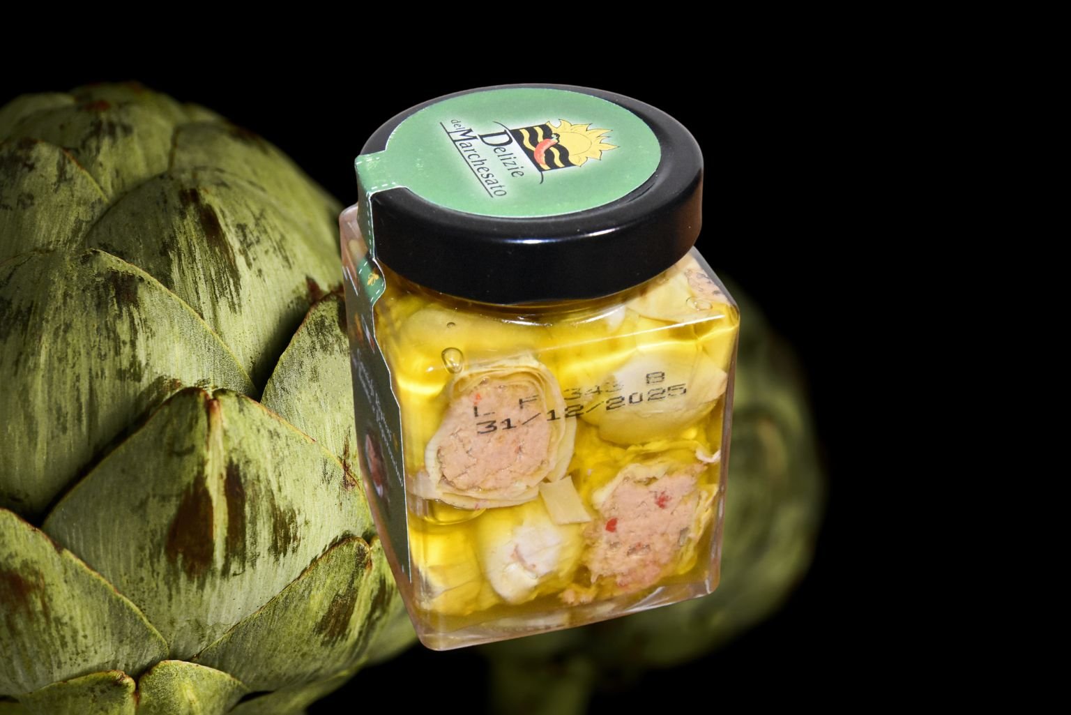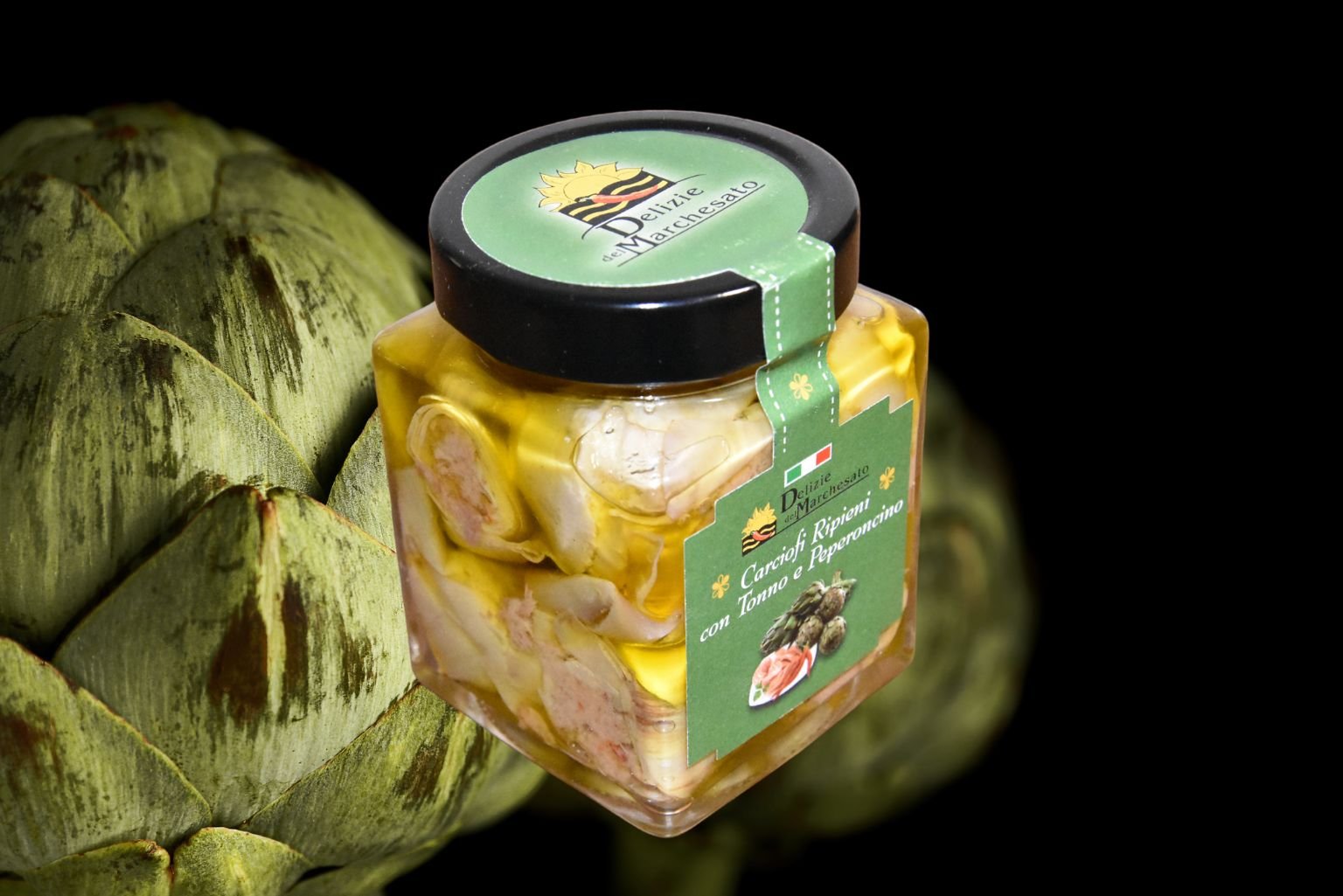 Questi carciofi ripieni sono un connubio perfetto di sapori, stuzzicanti e piccanti quanto basta a solleticare il vostro appetito.I carciofi utilizzati per questa conserva sono ortaggi selezionati e 100% italiani, dal gusto erbaceo e delicato che persiste al palato.