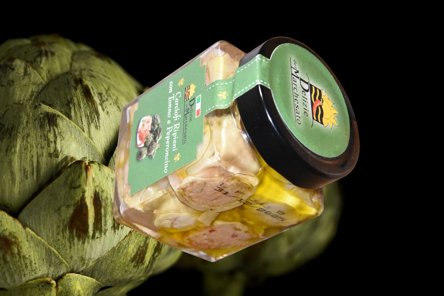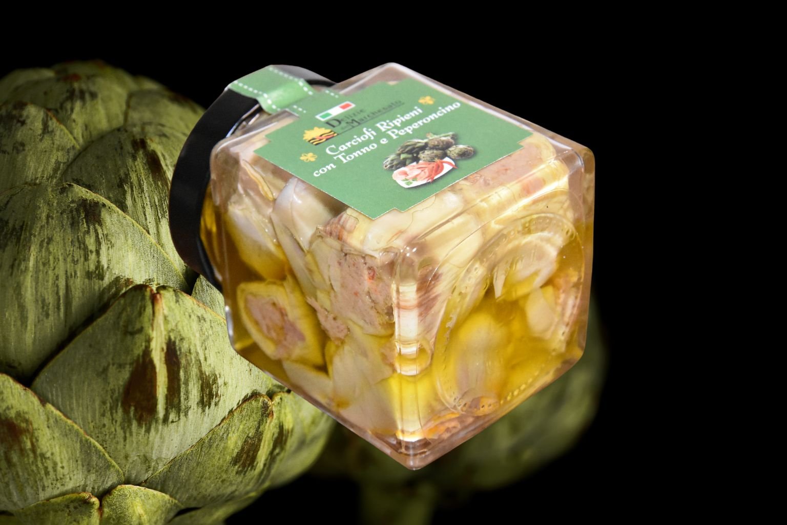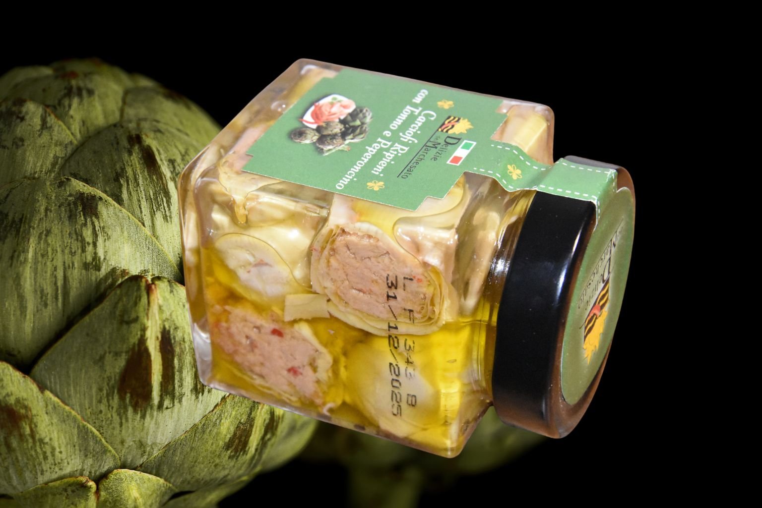 Il ripieno con il quale vengono riempiti i carciofi è realizzato con tonno di qualità e con l’ingrediente protagonista della cucina calabrese, il peperoncino piccante. La delicatezza e la morbidezza del carciofo si fondono con il ripieno dal gusto intenso e piccante, creando così una miscela perfetta di aromi, che insaporiranno le vostre pietanze. Consigliamo di gustare i carciofi ripieni in purezza, ma si prestano anche per la realizzazione di stuzzichini e spuntini saporiti, ideali per dare gusto ai vostri aperitivi in compagnia.