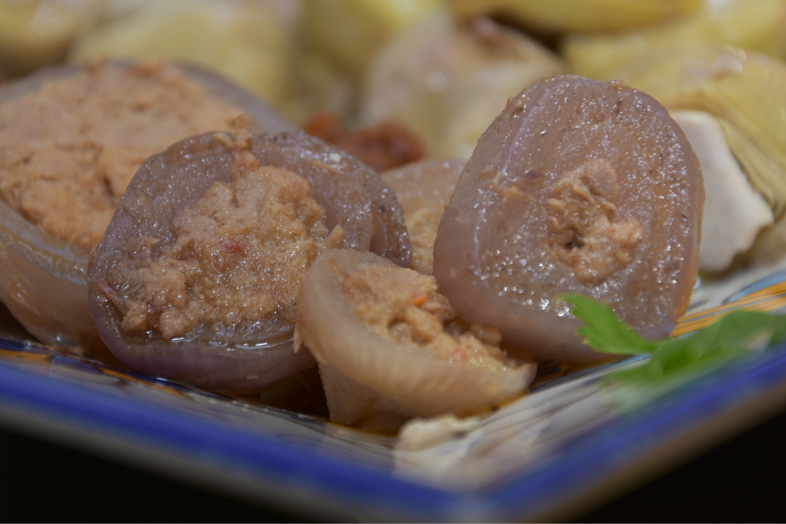 Cipolle rosse dolci provenienti dalla costa Calabrese farcite con uno sfizioso ripieno di tonno e peperoncino.  Le cipolle rosse di tropea nascono dai terreni limosi della costa tropeana e grazie al particolare microclima e al sole calabrese assumono proprietà uniche, che rendono quest’ortaggio delicato e dolce al gusto. Il ripieno con cui vengono farcite le cipolle è realizzato con tonno e peperoncino piccante, che insieme al gusto dolce della cipolla  crea un connubio di sapori che rende questa conserva particolarmente gustosa e succulenta. Le cipolle rosse  ripiene con tonno e peperoncino sono indicate per la preparazione di stuzzichini, antipasti e sfiziosi spuntini. Tutti i prodotti realizzati dai Fratelli Pellizzi sono realizzati seguendo le più antiche tecniche artigianali calabresi con prodotti 100% italiani, ideati per portare sulla vostra tavola i veri sapori tipici della Calabria.