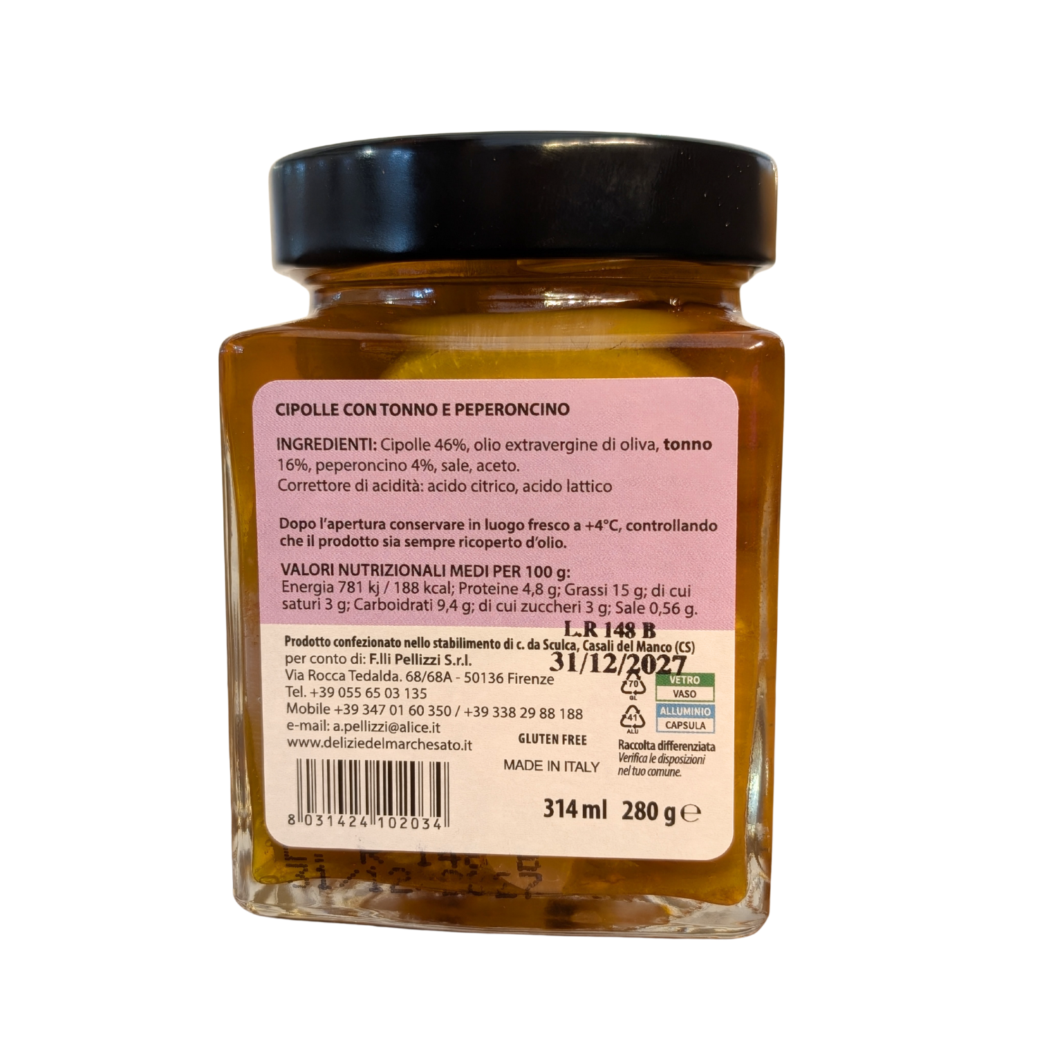 Ingredienti: Cipolle, olio extra vergine di oliva, tonno 16% , peperoncino 4%, aceto, sale.