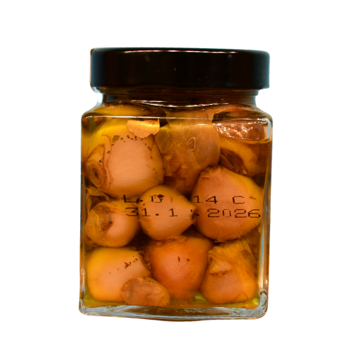 lampascioni 61%, olio extravergine d’oliva 38%, aceto di vino, pepe nero, aglio, menta, prezzemolo. Correttore di acidità : acido citrico.